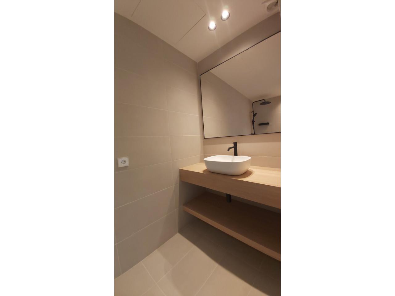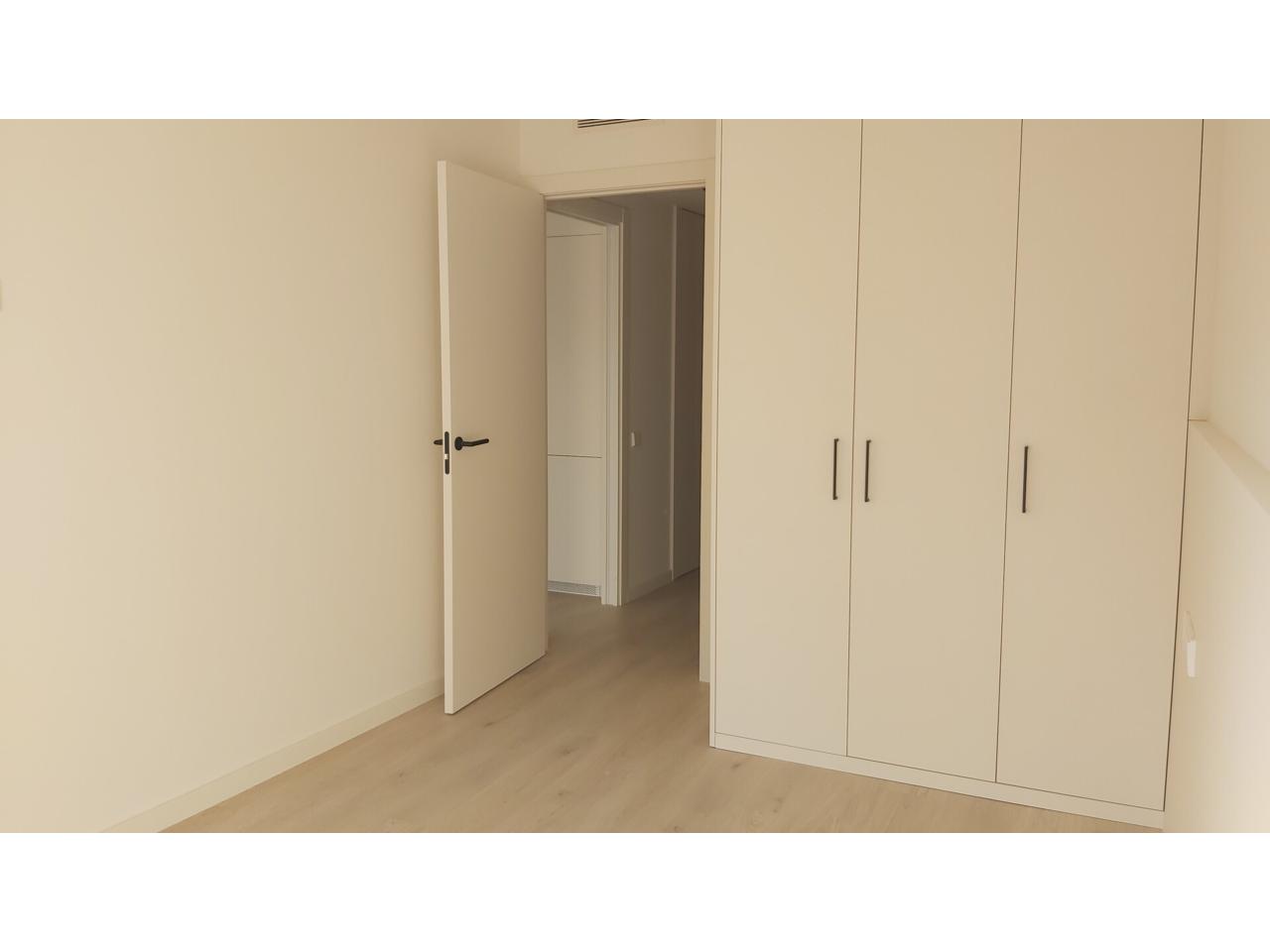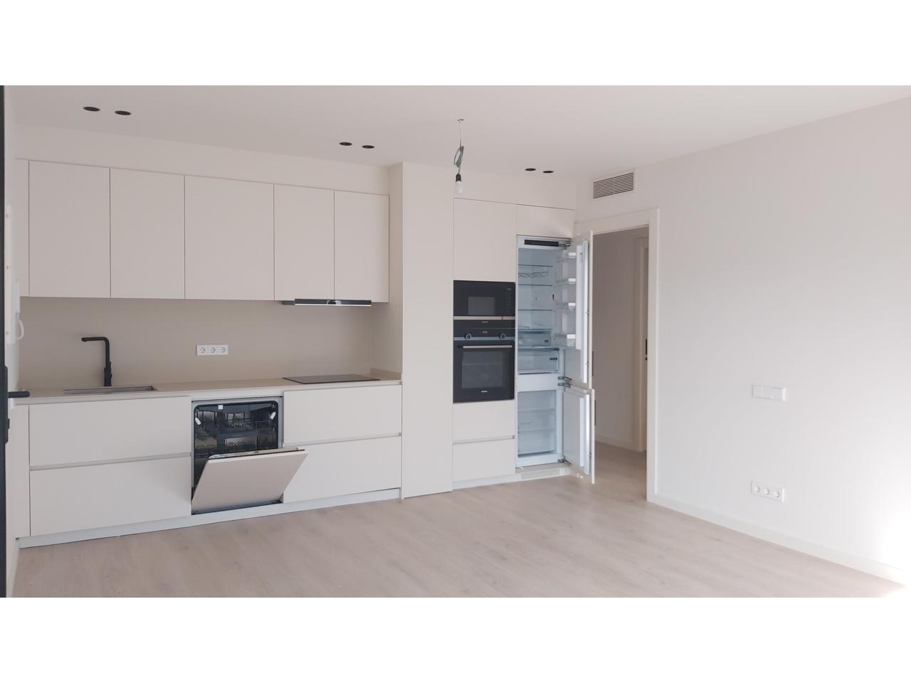 La vivienda se distribuye entrando directamente a zona de día, salón-comedor cocina en un mismo ambiente, totalmente soleado con salida directa a terraza privada. La cocina se ha ubicado en una sola pared dejando el resto de espacio libre para el salón-comedor. Está equipada con todos los electrodomésticos de buena calidad, panelados y no visibles para mantener la estética de la zona está el frigorifico y el lavavajillas.